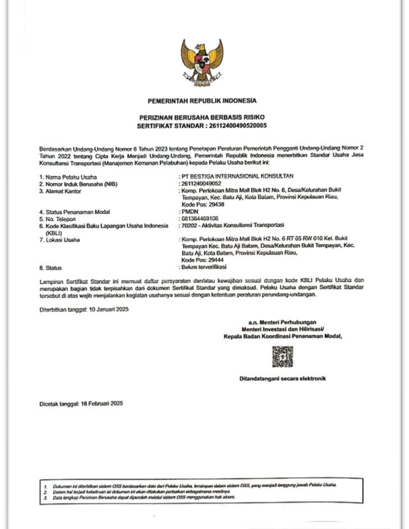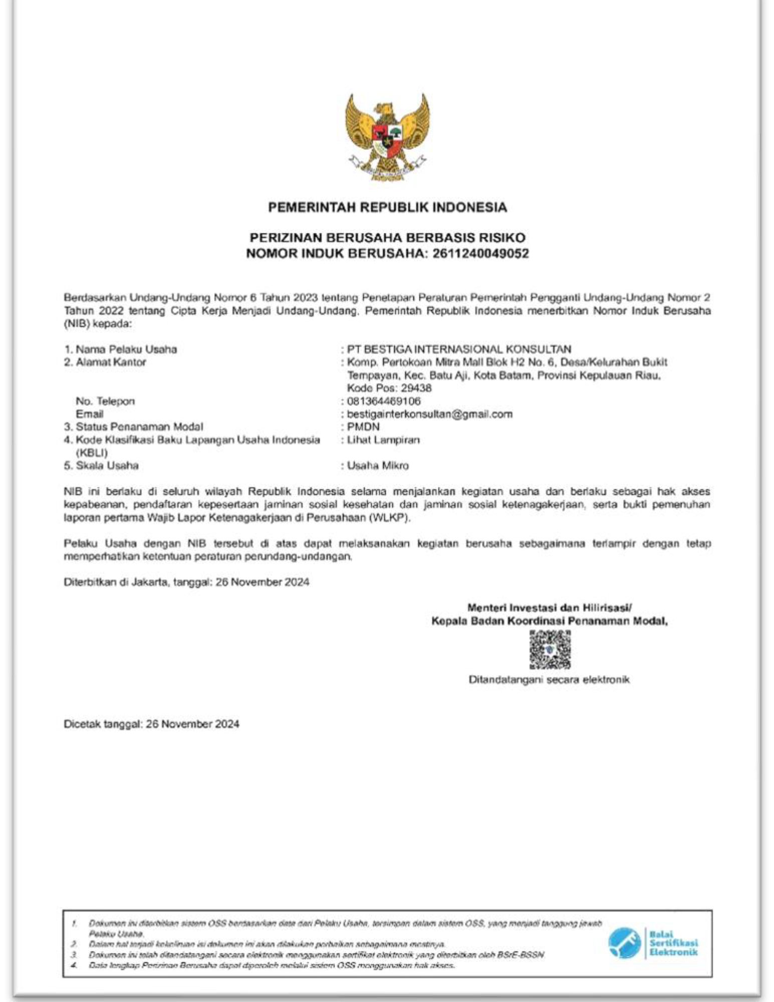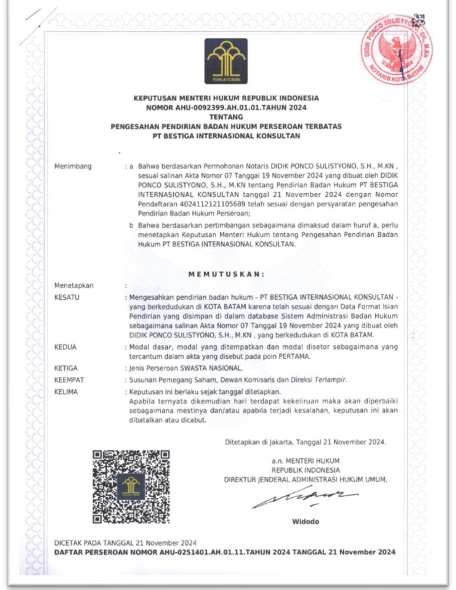 PT Bestiga Internasional Konsultan atau yang disingkat “BIK”berdiri pada November 2024 berdasarkan Akta Pendirian Perseroan Terbatas No: 07 Tertanggal 19 November 2024 dihadapan Notaris Didik Ponco Sulistyono di Kota Batamdengan Nomor Induk Berusaha (NIB) 26111240049052 & No. NPWP 21.309.637.3-225.000 serta telah mendapatkan pengesahan dari Menteri Hukum dan Hak Asasi Manusia Republik Indonesia dengan Nomor: AHU-0092399.AH.01.01 –21 November 2024.