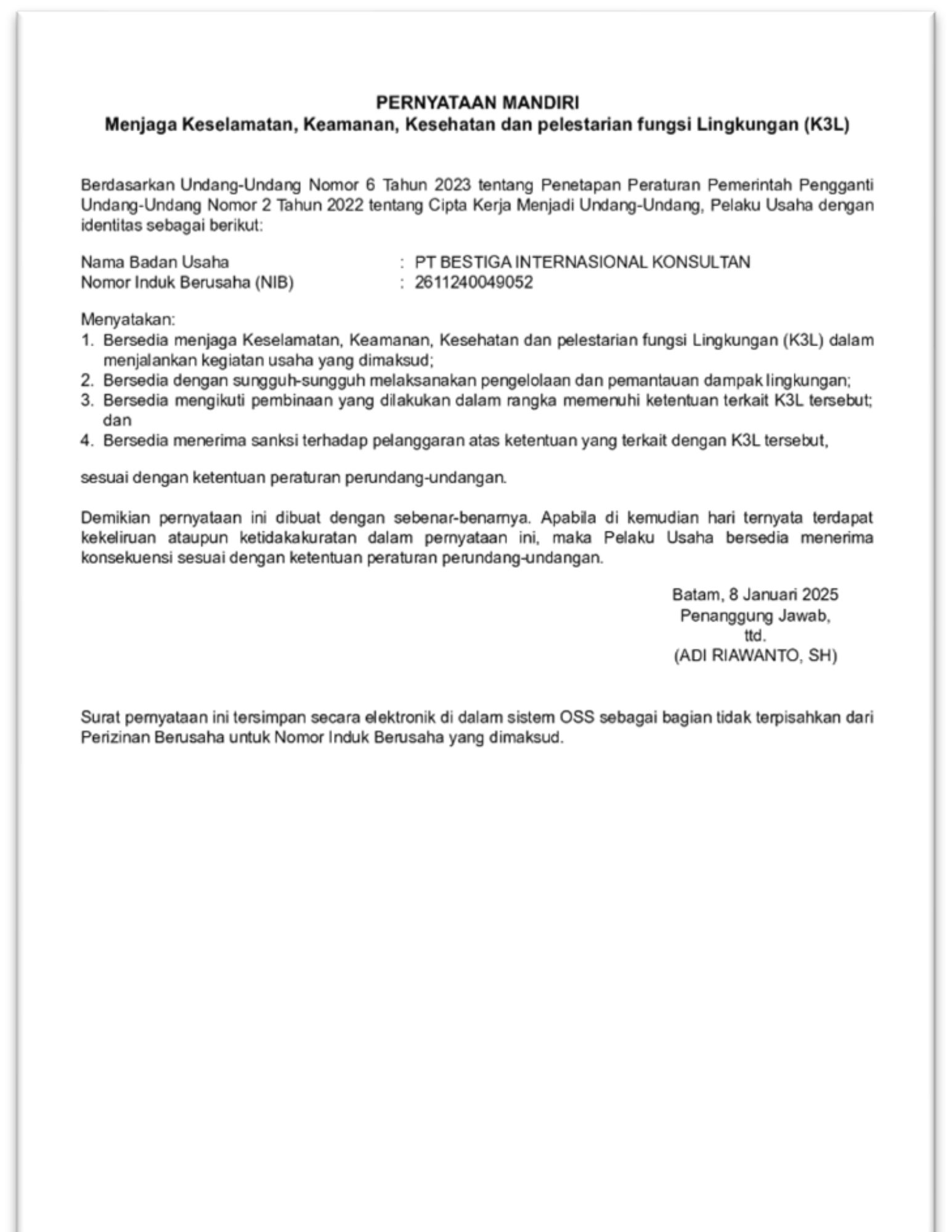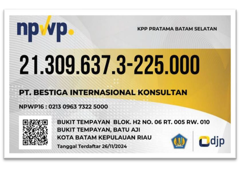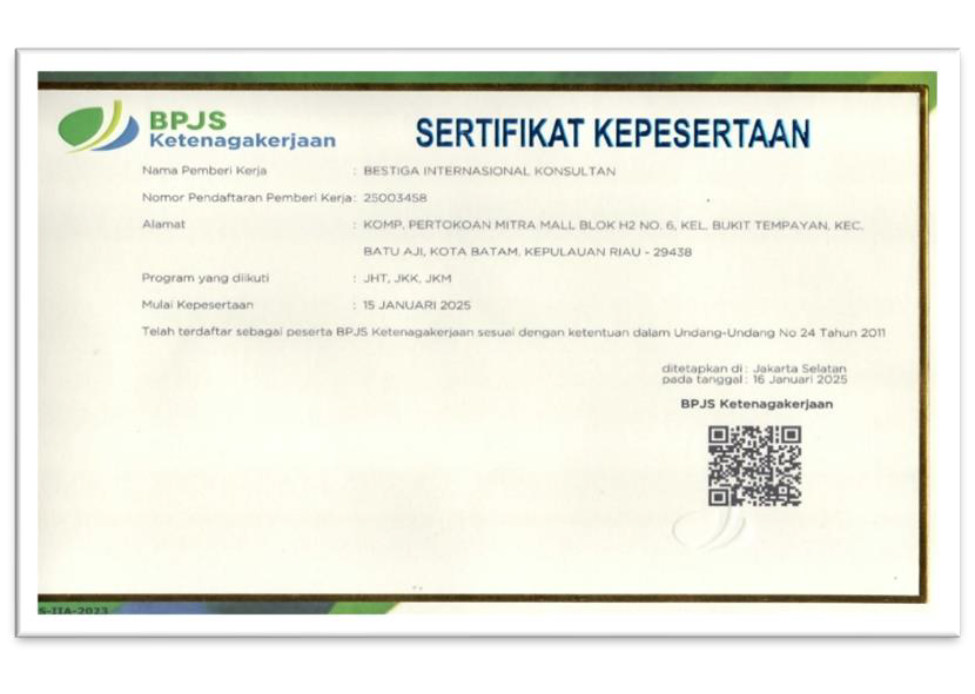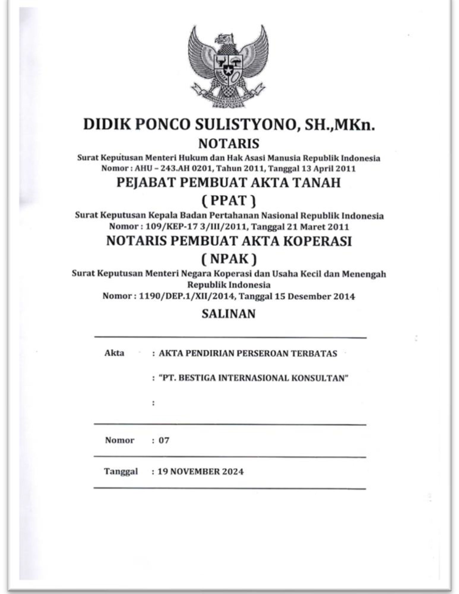PT Bestiga Internasional Konsultan atau yang disingkat “BIK”berdiri pada November 2024 berdasarkan Akta Pendirian Perseroan Terbatas No: 07 Tertanggal 19 November 2024 dihadapan Notaris Didik Ponco Sulistyono di Kota Batamdengan Nomor Induk Berusaha (NIB) 26111240049052 & No. NPWP 21.309.637.3-225.000 serta telah mendapatkan pengesahan dari Menteri Hukum dan Hak Asasi Manusia Republik Indonesia dengan Nomor: AHU-0092399.AH.01.01 –21 November 2024.