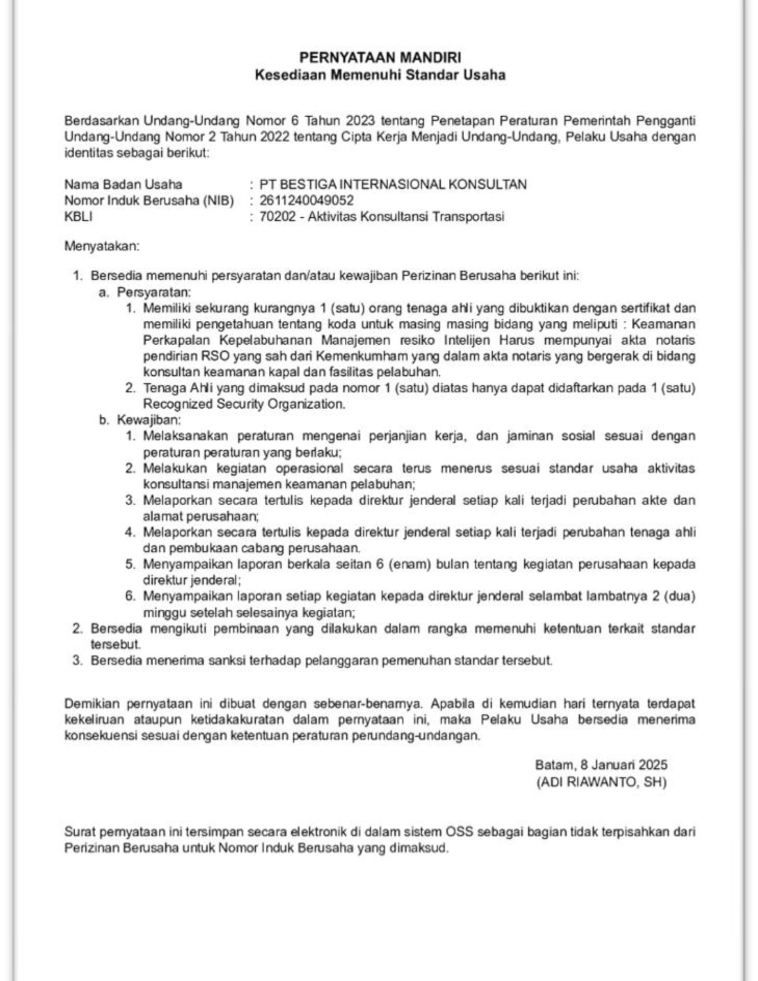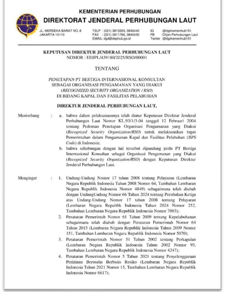 PT Bestiga Internasional Konsultan (BIK) telah mendapatkan izin penetapan dari Direktur Jenderal Perhubungan Laut (DJPL) sebagai organisasi pengamanan yang diakui dibidang Kapal dan Fasilitas Pelabuhan. Berdasarkan Surat Keputusan Nomor: